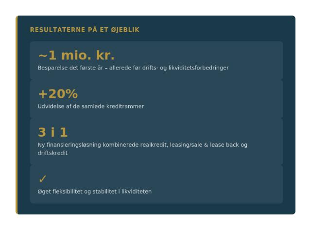 En besparelse på knap 1 million kroner det første år, 20% udvidede kreditrammer og øget likviditetsstabilitet har skabt den ro og det råderum, som EHRNO har brug for – ikke kun til den daglige drift, men til at tænke i vækst, udvikling og generationsskifte.